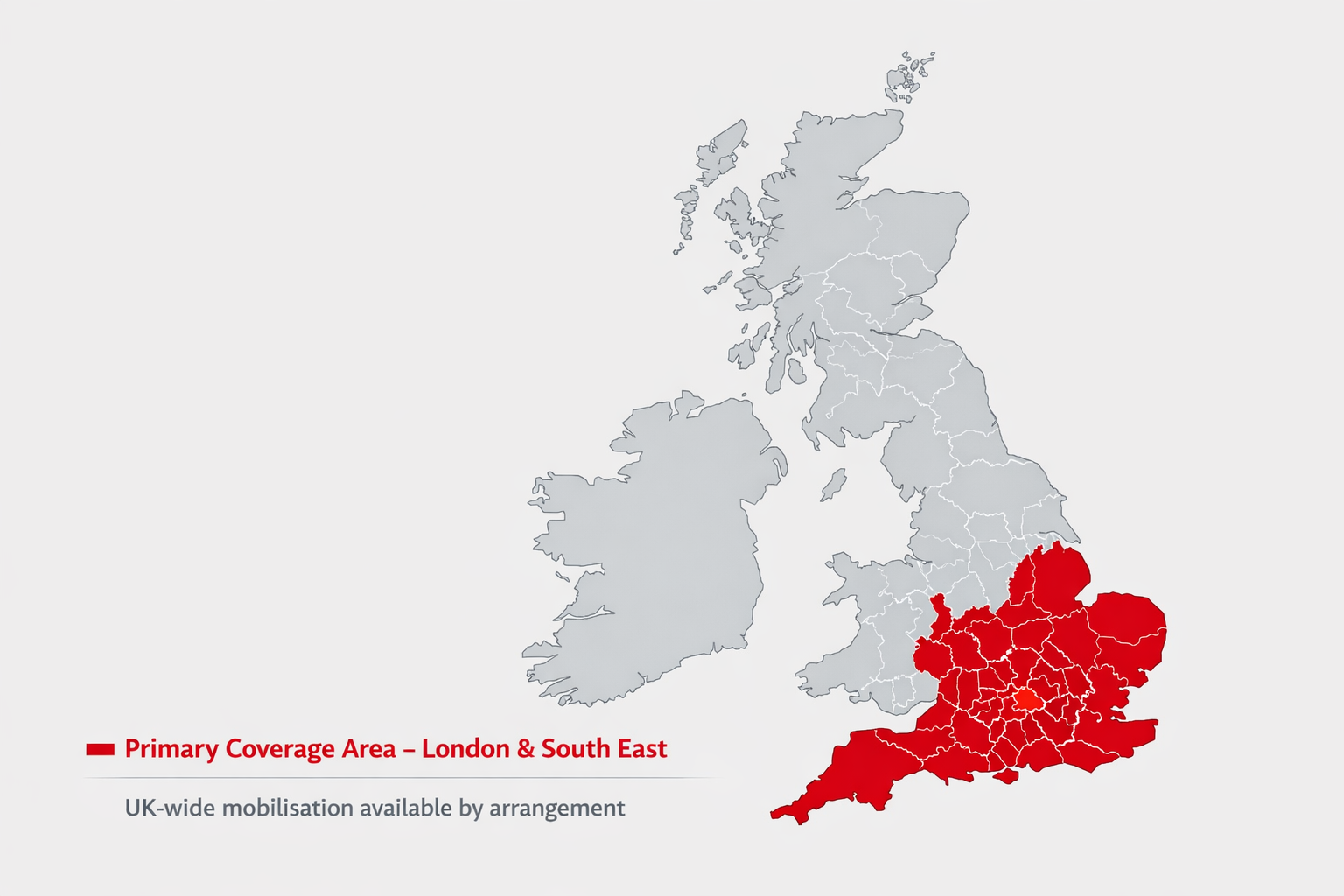 Primary coverage across London & the South-East — UK-wide mobilisation available by arrangement.